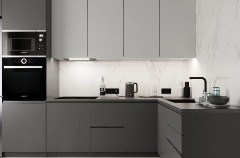 Исполнена в графитовом цвете, фасады сохраняют текстуру и рельеф шпона ясеня и красиво переливаются на свету, обладая матовым блеском. Тёмные шкафчики подчёркивают игрой контраста светлый фартук, а также хорошо комбинируется с цветом тёмной напольной плитки и со столешницей. Несмотря на то, что фасады гарнитура и пол разделены «полосами» стыков между дверцами, плитами и т.д., кухня не рябит в глазах и не становится похожа на расчерченную школьную тетрадь. Это происходит благодаря правильному балансу тёмных оттенков и белых в самом интерьере. Контрасты помещения сглаживаются на фоне наиболее явных – здесь это сочетание белого и графитового гарнитура. Проект выглядит очень минималистично. Поддержкой этого решения служит так же способ расстановки оборудования. Все необходимые элементы: посудомоечная машина, духовой шкаф с электроплитой – интегрированы в нижний ярус кухни. Микроволновая печь была также интегрирована и размещена в нижнем ярусе навесных шкафов, высота размещения удобна для того, что бы без лишних усилий загружать и доставать еду непосредственно из СВЧ. Высокая колонка по правой стороне кухни является корпусом для встроенного холодильника.
