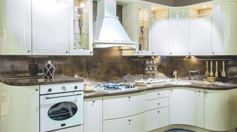 Плавные закругленные формы кухонного гарнитура «Марселла» гармонично вписываются в классический дизайн интерьера. Волнообразные черты характерны не только для фасадов – столешница также выполнена в такой концепции.