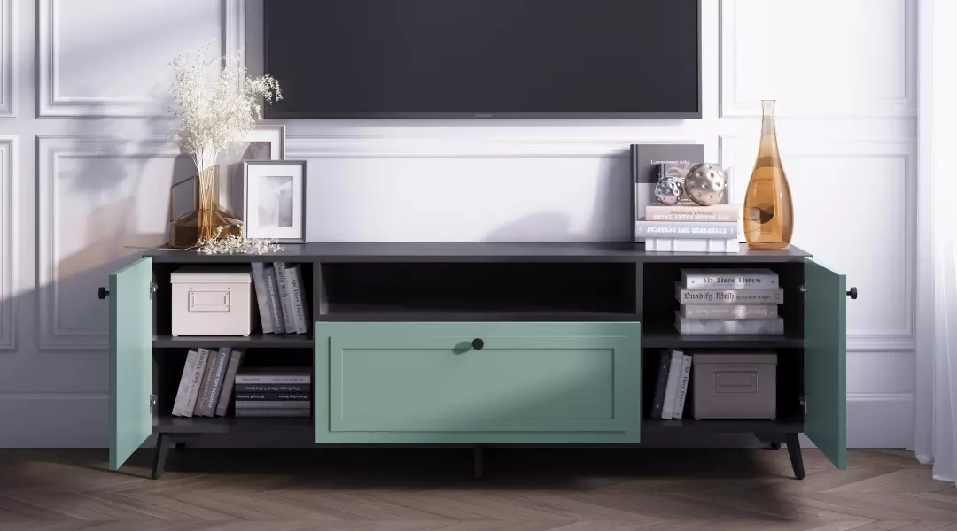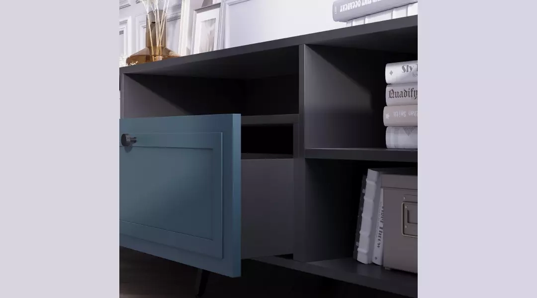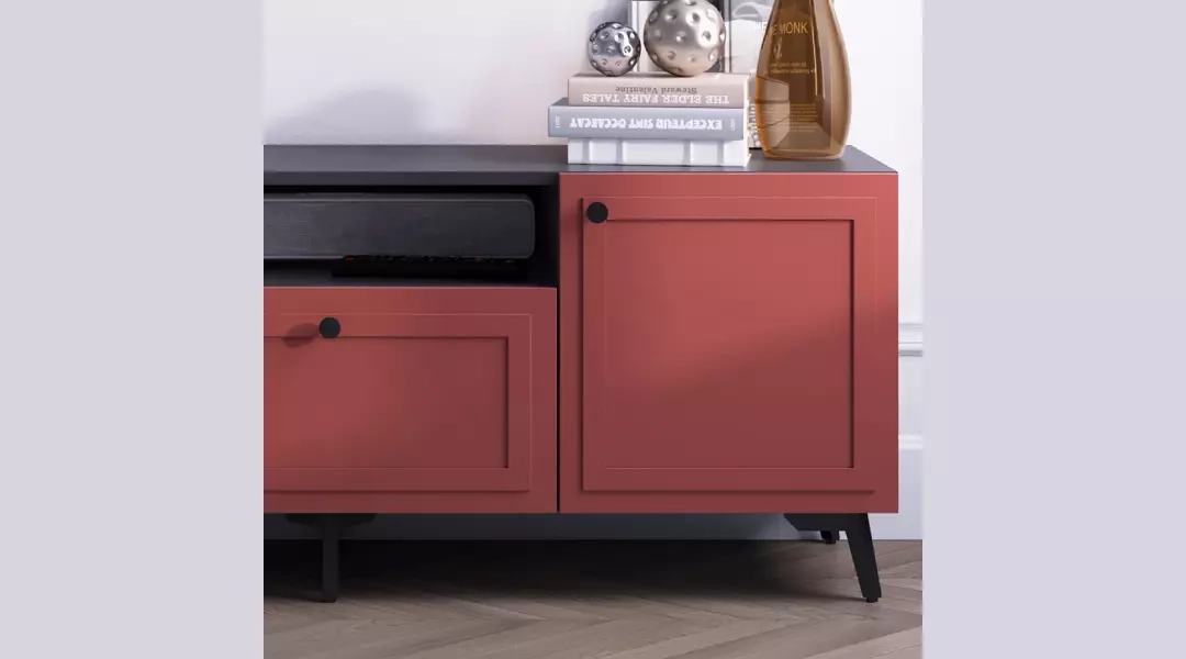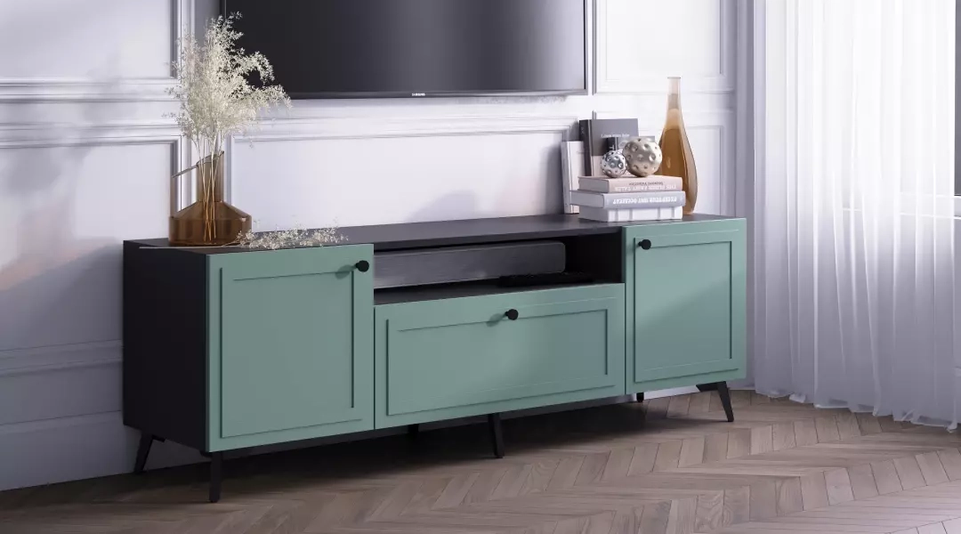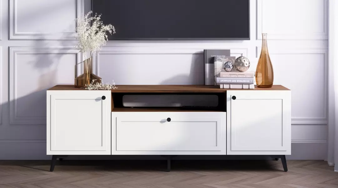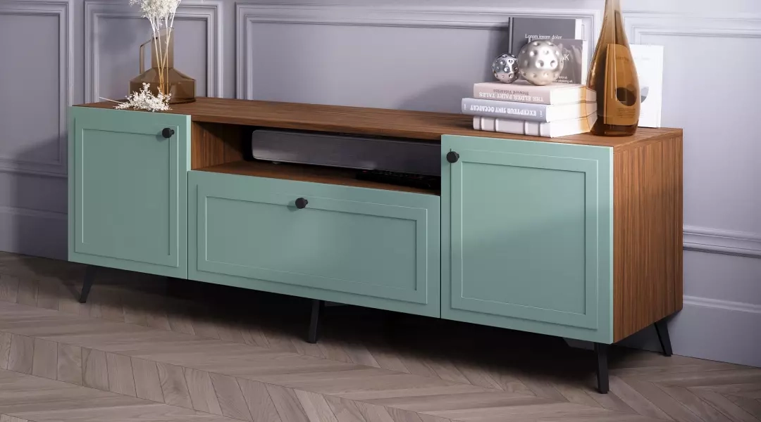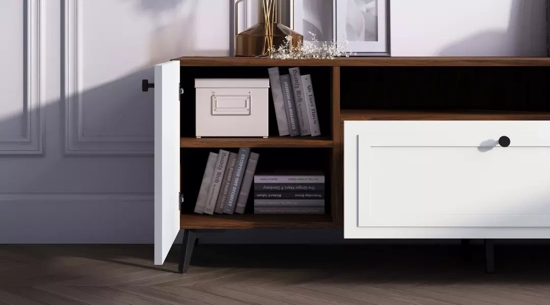 Черные декоративные металлические опоры, расположенные на нижней части тумбы, не только придают ей изысканный вид, но и обеспечивают дополнительную поддержку и надежность в использовании.Тумба под телевизор в стиле неоклассика с фасадом из МДФ молочного цвета и корпусом из ЛДСП цвета ореха - идеальный выбор для тех, кто ценит классический стиль и ищет функциональное и элегантное решение для хранения телевизора и других устройств.