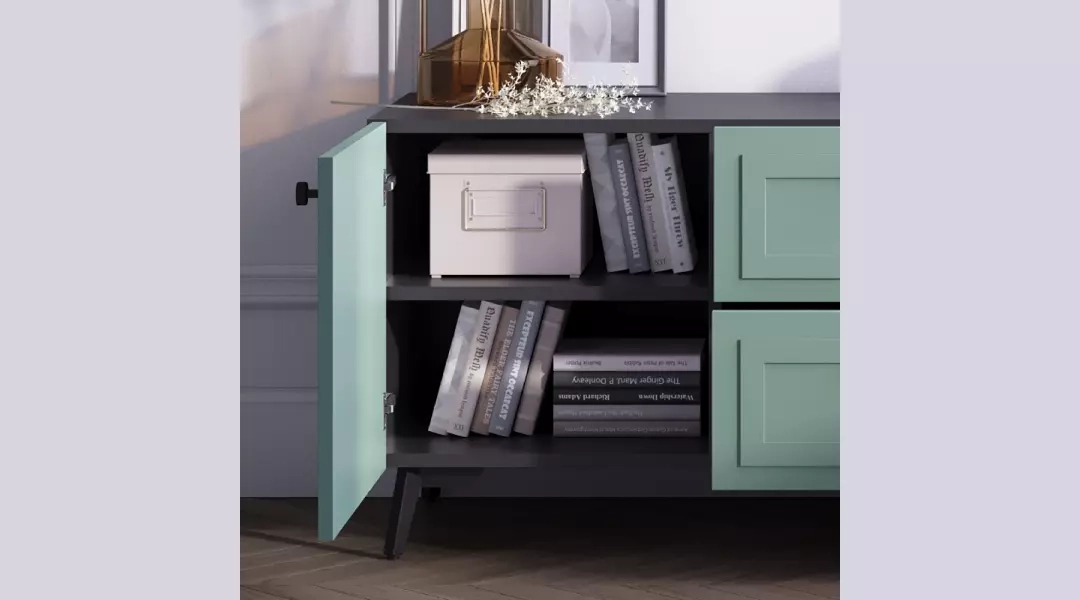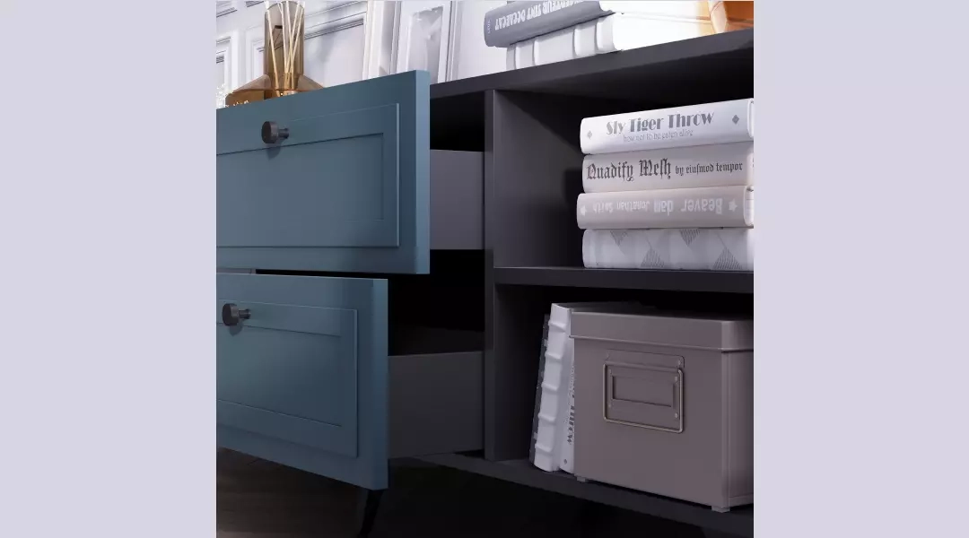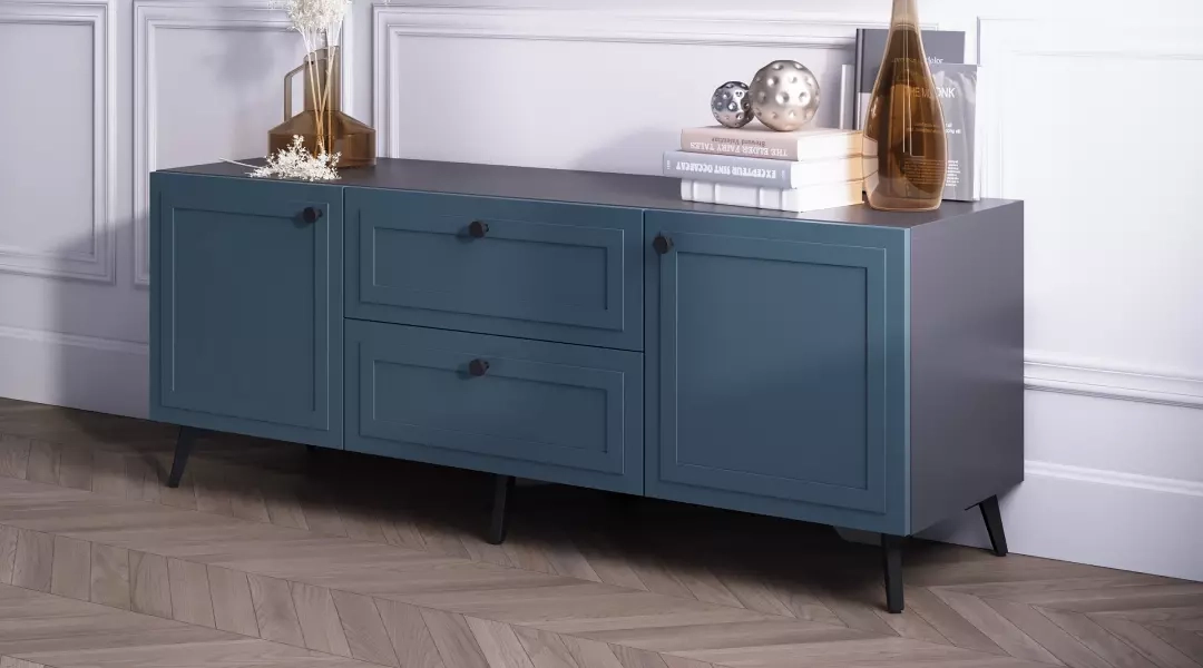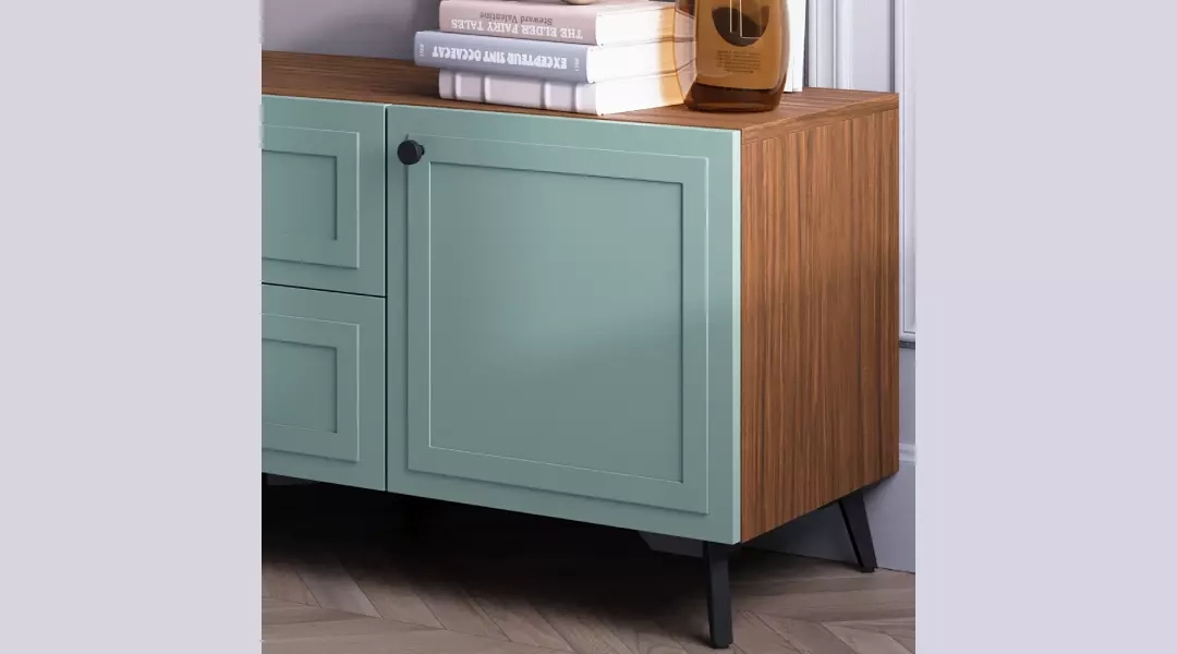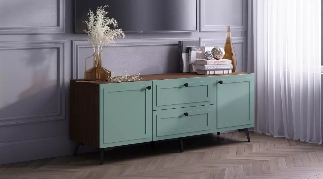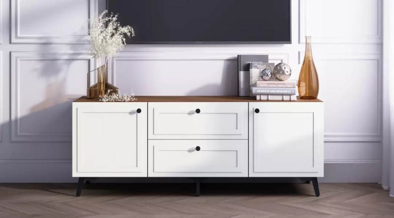 Черные декоративные металлические опоры, расположенные на нижней части тумбы, не только придают ей изысканный вид, но и обеспечивают дополнительную поддержку и надежность в использовании.Тумба под телевизор в стиле неоклассика с фасадом из МДФ молочного цвета и корпусом из ЛДСП цвета ореха - идеальный выбор для тех, кто ценит классический стиль и ищет функциональное и элегантное решение для хранения телевизора и других устройств.