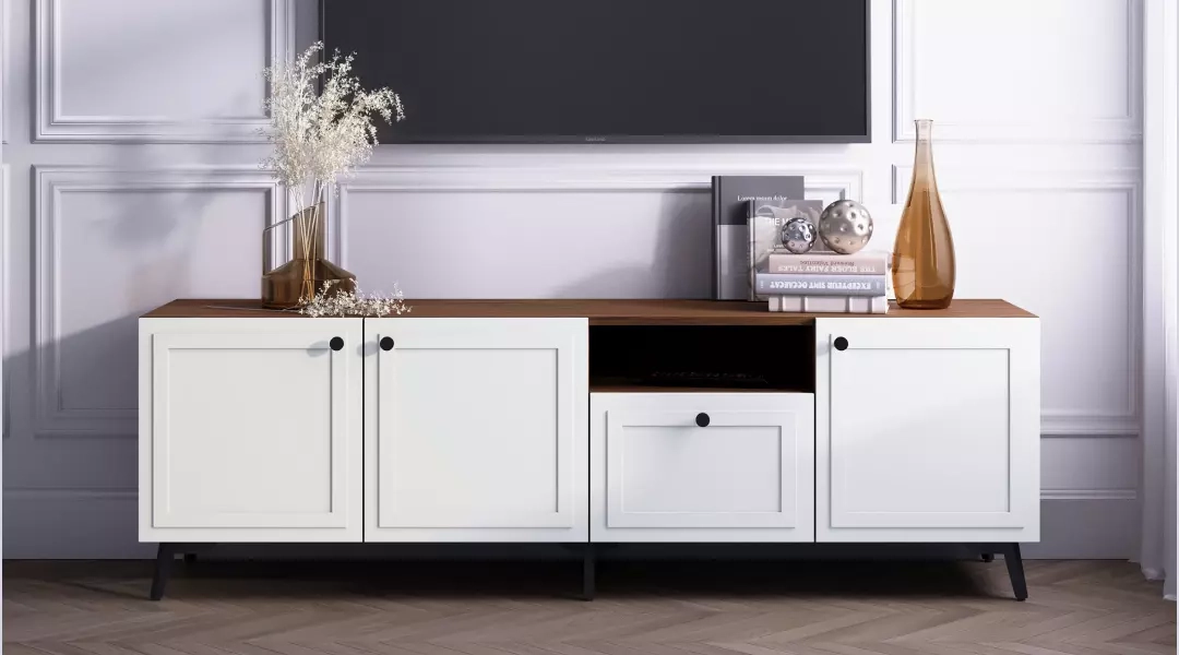 Черные декоративные металлические опоры, расположенные на нижней части тумбы, не только придают ей изысканный вид, но и обеспечивают дополнительную поддержку и надежность в использовании.Тумба под телевизор в стиле неоклассика с фасадом из МДФ молочного цвета и корпусом из ЛДСП цвета ореха - идеальный выбор для тех, кто ценит классический стиль и ищет функциональное и элегантное решение для хранения телевизора и других устройств.