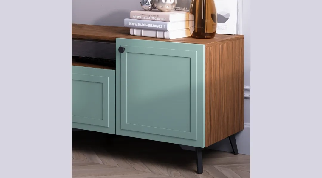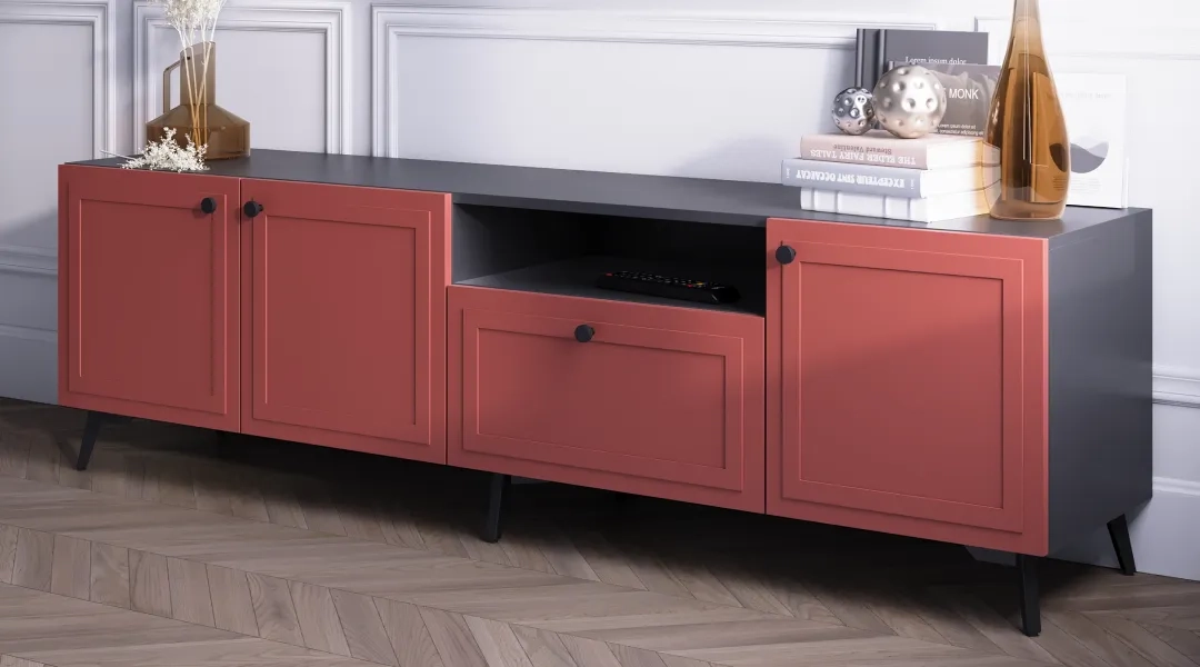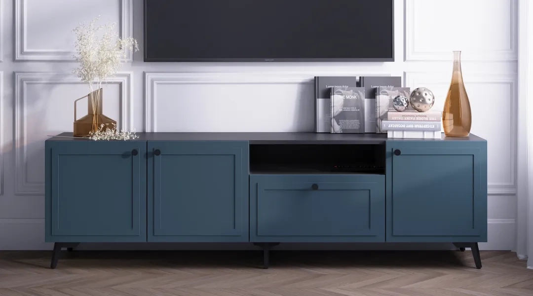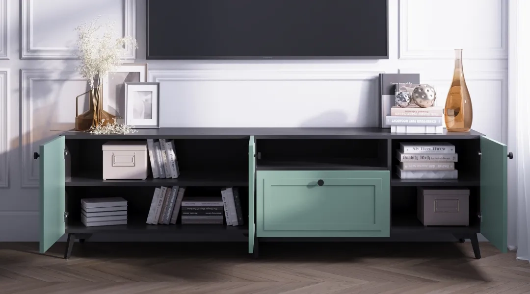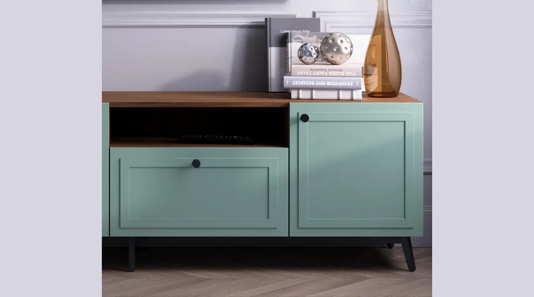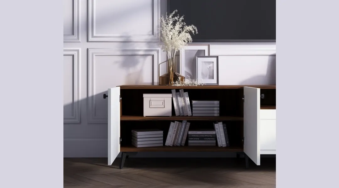 Черные декоративные металлические опоры, расположенные на нижней части тумбы, не только придают ей изысканный вид, но и обеспечивают дополнительную поддержку и надежность в использовании.Тумба под телевизор в стиле неоклассика с фасадом из МДФ молочного цвета и корпусом из ЛДСП цвета ореха - идеальный выбор для тех, кто ценит классический стиль и ищет функциональное и элегантное решение для хранения телевизора и других устройств.