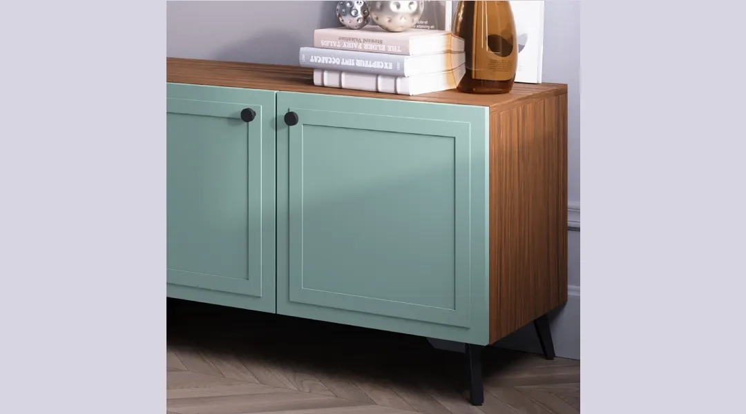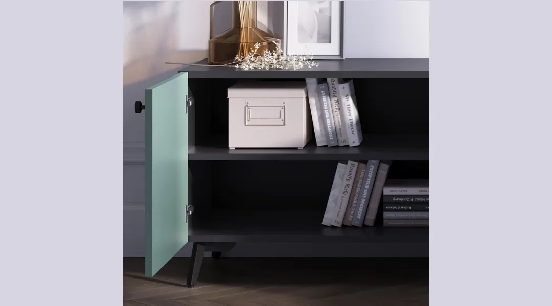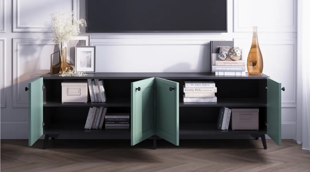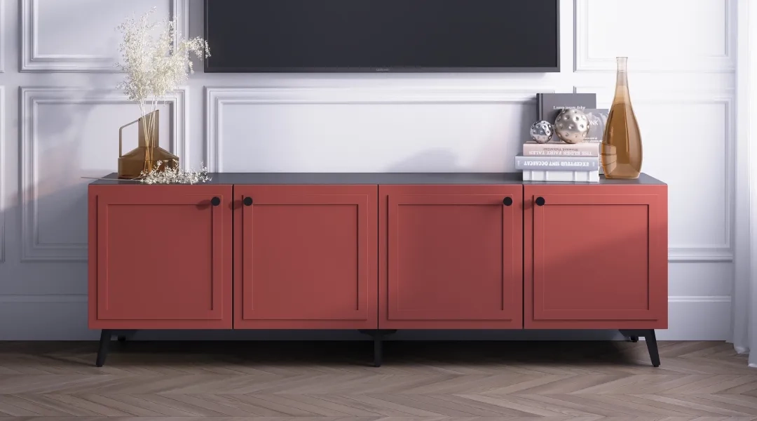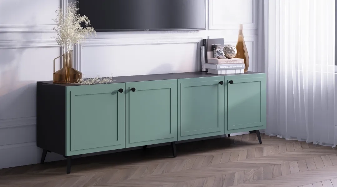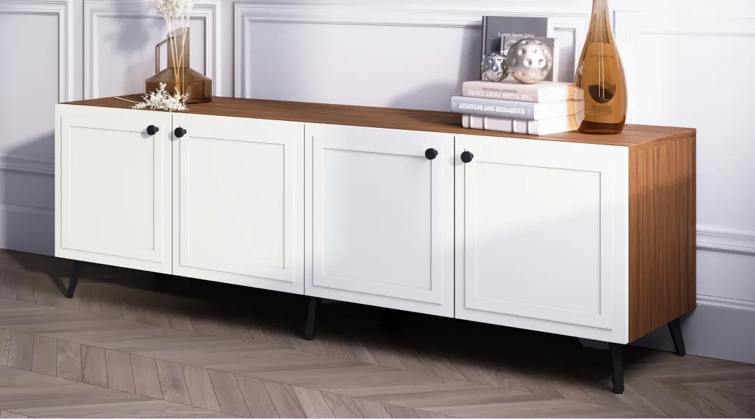Черные декоративные металлические опоры, расположенные на нижней части тумбы, не только придают ей изысканный вид, но и обеспечивают дополнительную поддержку и надежность в использовании.Тумба под телевизор в стиле неоклассика с фасадом из МДФ молочного цвета и корпусом из ЛДСП цвета ореха - идеальный выбор для тех, кто ценит классический стиль и ищет функциональное и элегантное решение для хранения телевизора и других устройств.