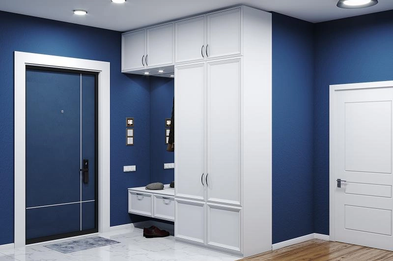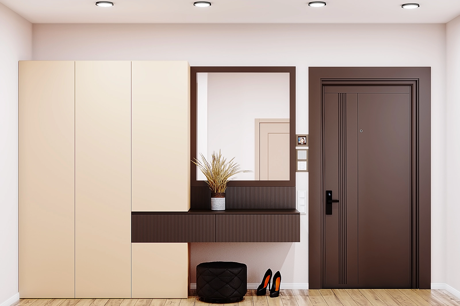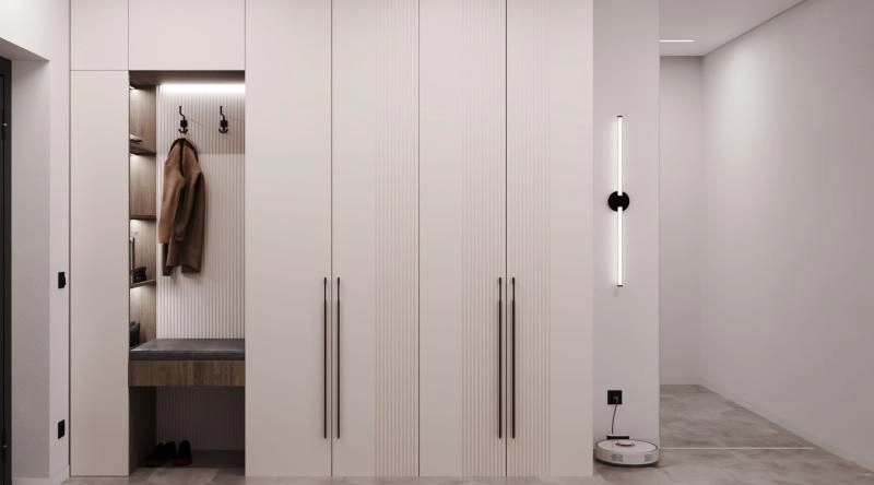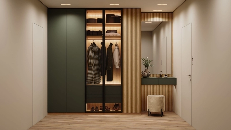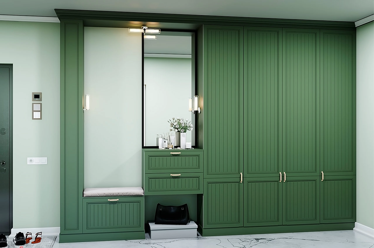 Шкафы, уходящие вверх до самого потолка и отделанные натуральным шпоном и матовой эмалью глубокого зеленого цвета, приносят в интерьер ощущение глубины и благородства. В фокусе интерьера - центральная секция с фасадами из прозрачного стекла, обрамленная в тонкую черную алюминиевую раму. Все детали интерьера соединяет стеновая панель с фрезеровкой JAZZ, выполненная в шпоне, и элегантная консоль в зеленой эмали.