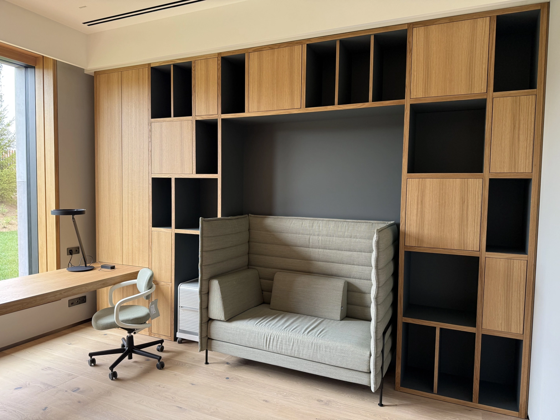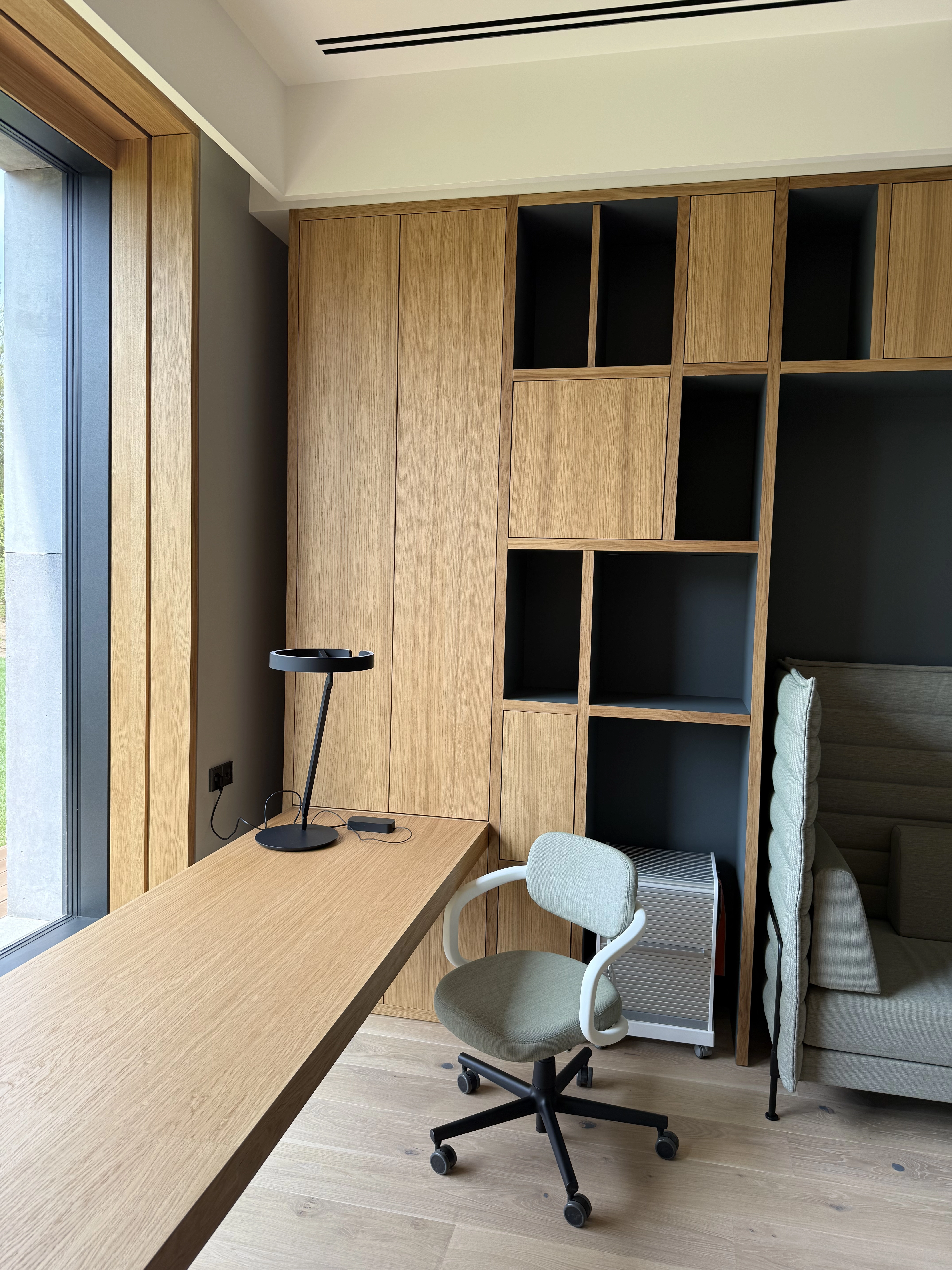 На фото представлен письменный стол и встроенные шкафы на заказ, выполненные по проекту ведущего европейского архитектурного бюро. Для изготовления мебели использованы премиальные материалы: натуральный шпон дуба и инновационный итальянский пластик Fenix.
