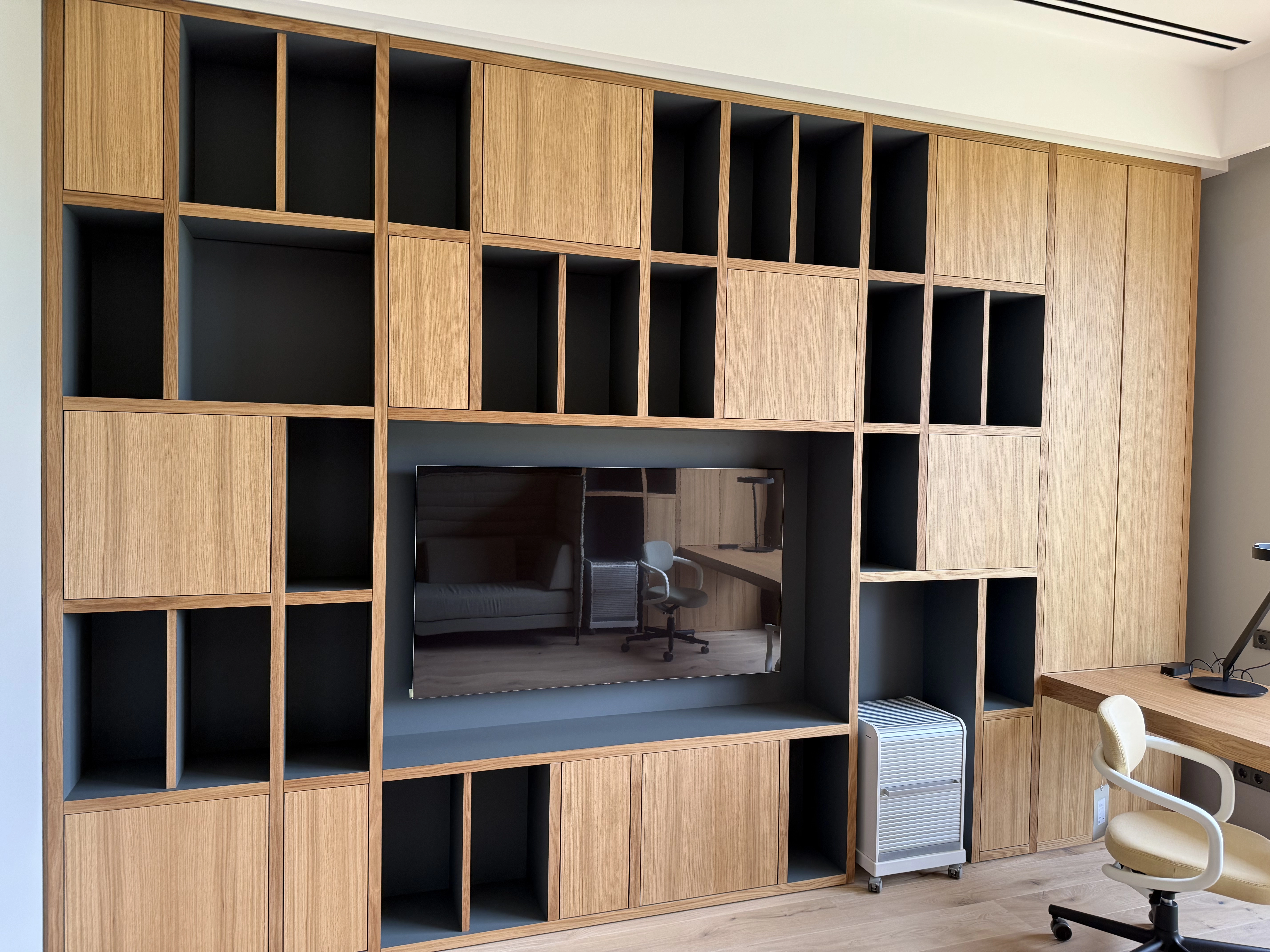 Главная особенность проекта — тщательная проработка деталей и высокое качество исполнения:- цельный рисунок древесины сохранён благодаря точному подбору шпона дуба